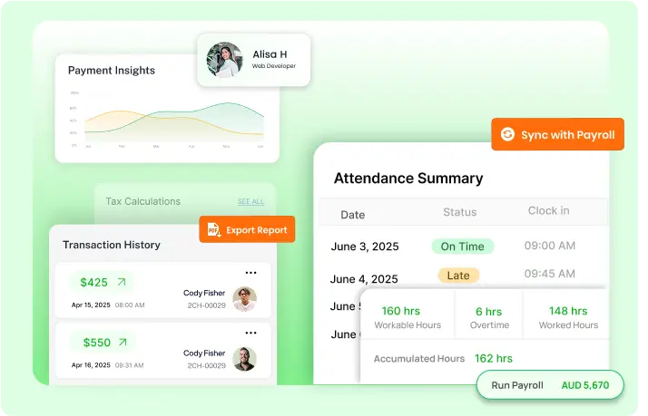 Generate accurate salaries by auto-syncing worked hours, leaves, and approved overtime.