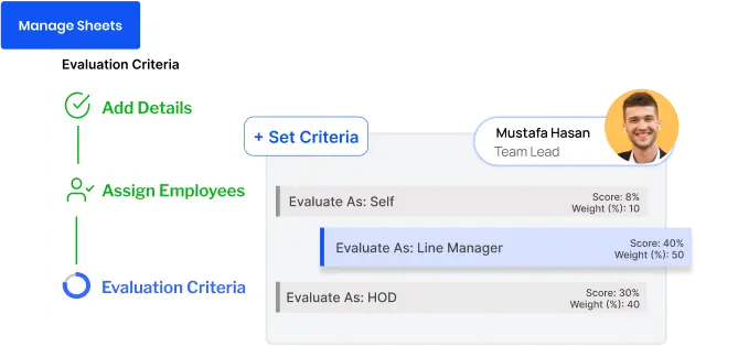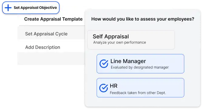Set appraisal criteria like Self, Line Manager, and HR feedback to assess performance and conduct effective employee evaluation.