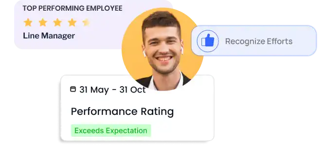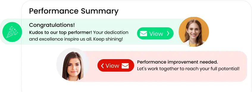 performance review cycle popup notification UIemployee performance rating popup UIrecognize employee effort thumbs up popup UIauto sync performance summary popup UItop performance employee rating percentage UI